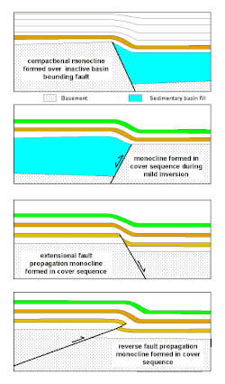- ↑ Willsey S.P., Umhoefer, P.J. & Hilley, G.E. (2002), Early evolution of an extensional monocline by a propagating normal fault: 3D analysis from combined field study and numerical modeling ; Journal of Structural Geology ; volume= 24 ; pages 651 à 669 (lien, Doi=10.1016/S0191-8141(01)00120-1|bibcode:2002JSG....24..651W)