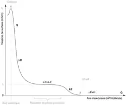 Une monocouche peut être comprimée en modifiant la surface disponible par l'action d'une barrière mobile dans une balance de Langmuir. Si l'on mesure la tension superficielle durant la compression, on obtient un isotherme de compression (ci-contre) qui montre la variation de la pression de surface π, en mN/m, en fonction de l'aire moléculaire (en Å2/molécule). Ceci est équivalent à ce que l'on observe dans un modèle en trois dimensions : la pression varie en fonction du volume.