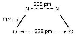 Des calculs ab inito SCF ont montré que la forme cis du dimère (NO)2 présenterait les distances d(N-N) = 174 pm et d(O-O) = 116 pm et un angle O-N-N de 107°[21]. Ces valeurs sont sensiblement différentes de celles déduites de données de diffraction de rayons X en phase solide désordonnée (voir figure ci-contre)[22]. Cette disparité des valeurs confirme la difficulté d'étudier un dimère dont la formation est fugace.