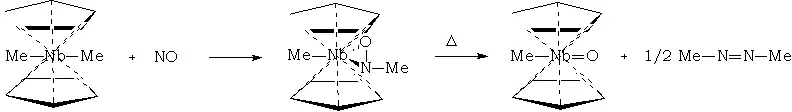 La chimie des composés de coordination de NO est vaste et ne sera abordée que brièvement. Par exemple NO s'insère entre le niobium et un ligand méthyle dans la réaction suivante :