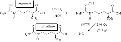 Il est synthétisé naturellement par le corps à partir de la L-arginine et de l'oxygène par plusieurs enzymes dites NO synthases (NOS), qui sont des hémoprotéines[26] proches du cytochrome P450. Le catalyseur de l'oxydation par l'oxygène du groupe iminourée de l'arginine est donc le fer de l'hème qui passe du degré d'oxydation +II aux degrés +III et +IV et vice-versa.