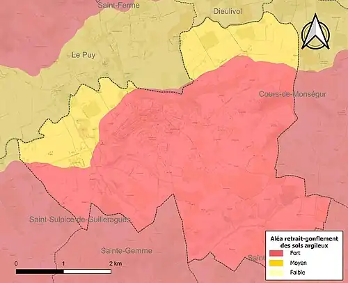 Le retrait-gonflement des sols argileux est susceptible d'engendrer des dommages importants aux bâtiments en cas d’alternance de périodes de sécheresse et de pluie. La totalité de la commune est en aléa moyen ou fort (67,4 % au niveau départemental et 48,5 % au niveau national). Sur les 755 bâtiments dénombrés sur la commune en 2019, 755 sont en aléa moyen ou fort, soit 100 %, à comparer aux 84 % au niveau départemental et 54 % au niveau national. Une cartographie de l'exposition du territoire national au retrait gonflement des sols argileux est disponible sur le site du BRGM[17],[Carte 2].