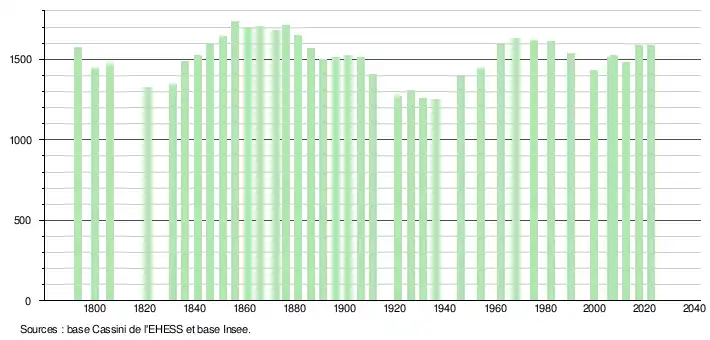 L'évolution du nombre d'habitants est connue à travers les recensements de la population effectués dans la commune depuis 1793. Pour les communes de moins de 10 000 habitants, une enquête de recensement portant sur toute la population est réalisée tous les cinq ans, les populations de référence des années intermédiaires étant quant à elles estimées par interpolation ou extrapolation[27]. Pour la commune, le premier recensement exhaustif entrant dans le cadre du nouveau dispositif a été réalisé en 2007[28].