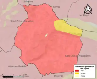La commune est vulnérable au risque de mouvements de terrains constitué principalement du retrait-gonflement des sols argileux[16]. Cet aléa est susceptible d'engendrer des dommages importants aux bâtiments en cas d’alternance de périodes de sécheresse et de pluie. 99,9 % de la superficie communale est en aléa moyen ou fort (67,5 % au niveau départemental et 48,5 % au niveau national). Sur les 750 bâtiments dénombrés sur la commune en 2019, 749 sont en aléa moyen ou fort, soit 100 %, à comparer aux 90 % au niveau départemental et 54 % au niveau national. Une cartographie de l'exposition du territoire national au retrait gonflement des sols argileux est disponible sur le site du BRGM[17],[Carte 2].