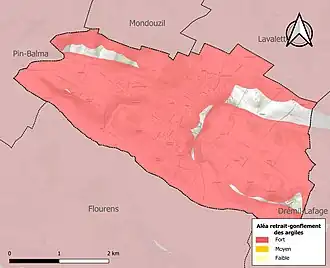 Le retrait-gonflement des sols argileux est susceptible d'engendrer des dommages importants aux bâtiments en cas d’alternance de périodes de sécheresse et de pluie. 91,8 % de la superficie communale est en aléa moyen ou fort (88,8 % au niveau départemental et 48,5 % au niveau national). Sur les 637 bâtiments dénombrés sur la commune en 2019, 608 sont en aléa moyen ou fort, soit 95 %, à comparer aux 98 % au niveau départemental et 54 % au niveau national. Une cartographie de l'exposition du territoire national au retrait gonflement des sols argileux est disponible sur le site du BRGM[22],[Carte 3].