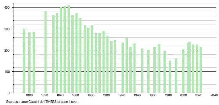 L'évolution du nombre d'habitants est connue à travers les recensements de la population effectués dans la commune depuis 1793. Pour les communes de moins de 10 000 habitants, une enquête de recensement portant sur toute la population est réalisée tous les cinq ans, les populations de référence des années intermédiaires étant quant à elles estimées par interpolation ou extrapolation[41]. Pour la commune, le premier recensement exhaustif entrant dans le cadre du nouveau dispositif a été réalisé en 2007[42].