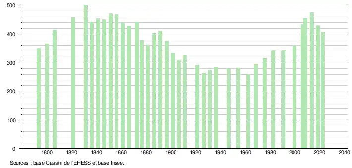 L'évolution du nombre d'habitants est connue à travers les recensements de la population effectués dans la commune depuis 1793. Pour les communes de moins de 10 000 habitants, une enquête de recensement portant sur toute la population est réalisée tous les cinq ans, les populations de référence des années intermédiaires étant quant à elles estimées par interpolation ou extrapolation[29]. Pour la commune, le premier recensement exhaustif entrant dans le cadre du nouveau dispositif a été réalisé en 2008[30].
