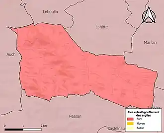 Le retrait-gonflement des sols argileux est susceptible d'engendrer des dommages importants aux bâtiments en cas d’alternance de périodes de sécheresse et de pluie. La totalité de la commune est en aléa moyen ou fort (94,5 % au niveau départemental et 48,5 % au niveau national). Sur les 225 bâtiments dénombrés sur la commune en 2019, 225 sont en aléa moyen ou fort, soit 100 %, à comparer aux 93 % au niveau départemental et 54 % au niveau national. Une cartographie de l'exposition du territoire national au retrait gonflement des sols argileux est disponible sur le site du BRGM[20],[Carte 3].