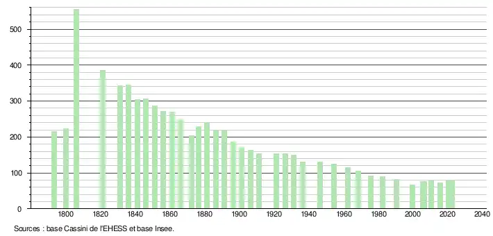 L'évolution du nombre d'habitants est connue à travers les recensements de la population effectués dans la commune depuis 1793. Pour les communes de moins de 10 000 habitants, une enquête de recensement portant sur toute la population est réalisée tous les cinq ans, les populations de référence des années intermédiaires étant quant à elles estimées par interpolation ou extrapolation[38]. Pour la commune, le premier recensement exhaustif entrant dans le cadre du nouveau dispositif a été réalisé en 2005[39].