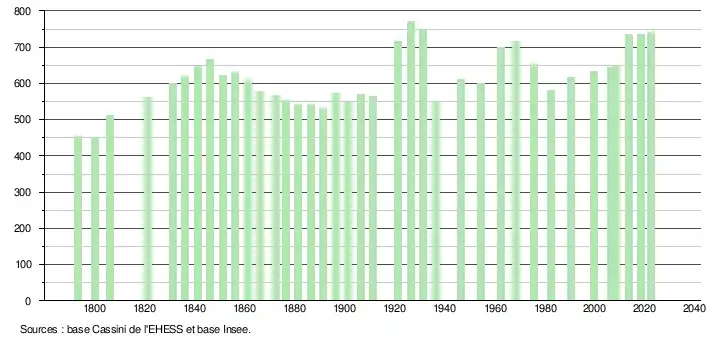 L'évolution du nombre d'habitants est connue à travers les recensements de la population effectués dans la commune depuis 1793. Pour les communes de moins de 10 000 habitants, une enquête de recensement portant sur toute la population est réalisée tous les cinq ans, les populations de référence des années intermédiaires étant quant à elles estimées par interpolation ou extrapolation[30]. Pour la commune, le premier recensement exhaustif entrant dans le cadre du nouveau dispositif a été réalisé en 2008[31].