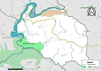 L’inventaire des zones naturelles d'intérêt écologique, faunistique et floristique (ZNIEFF) a pour objectif de réaliser une couverture des zones les plus intéressantes sur le plan écologique, essentiellement dans la perspective d’améliorer la connaissance du patrimoine naturel national et de fournir aux différents décideurs un outil d’aide à la prise en compte de l’environnement dans l’aménagement du territoire. Une ZNIEFF de type 1[Note 2] est recensée sur la commune[13] : la « vallée du Dadou » (3 063 ha), couvrant 7 communes du département[14].