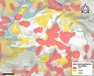La commune est vulnérable au risque de mouvements de terrains constitué principalement du retrait-gonflement des sols argileux[21]. Cet aléa est susceptible d'engendrer des dommages importants aux bâtiments en cas d’alternance de périodes de sécheresse et de pluie. 48,5 % de la superficie communale est en aléa moyen ou fort (76,3 % au niveau départemental et 48,5 % au niveau national). Sur les 121 bâtiments dénombrés sur la commune en 2019, 75 sont en aléa moyen ou fort, soit 62 %, à comparer aux 90 % au niveau départemental et 54 % au niveau national. Une cartographie de l'exposition du territoire national au retrait gonflement des sols argileux est disponible sur le site du BRGM[22],[Carte 3].