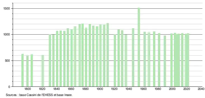 - ↑ Fiches Insee - Populations de référence de la commune pour les années 2006, 2007, 2008, 2009, 2010, 2011, 2012, 2013, 2014, 2015, 2016, 2017, 2018, 2019, 2020, 2021 et 2022.
