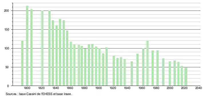 L'évolution du nombre d'habitants est connue à travers les recensements de la population effectués dans la commune depuis 1793. Pour les communes de moins de 10 000 habitants, une enquête de recensement portant sur toute la population est réalisée tous les cinq ans, les populations de référence des années intermédiaires étant quant à elles estimées par interpolation ou extrapolation[19]. Pour la commune, le premier recensement exhaustif entrant dans le cadre du nouveau dispositif a été réalisé en 2006[20].