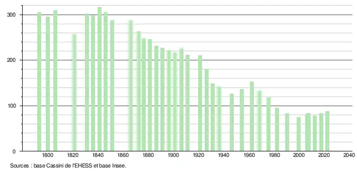 L'évolution du nombre d'habitants est connue à travers les recensements de la population effectués dans la commune depuis 1793. Pour les communes de moins de 10 000 habitants, une enquête de recensement portant sur toute la population est réalisée tous les cinq ans, les populations de référence des années intermédiaires étant quant à elles estimées par interpolation ou extrapolation[20]. Pour la commune, le premier recensement exhaustif entrant dans le cadre du nouveau dispositif a été réalisé en 2007[21].