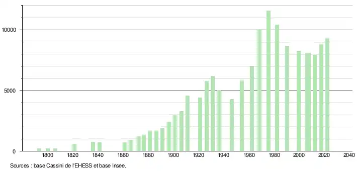 - ↑ Population municipale de référence en vigueur au 1er janvier 2025, millésimée 2022, définie dans les limites territoriales en vigueur au 1er janvier 2024, date de référence statistique : 1er janvier 2022.
