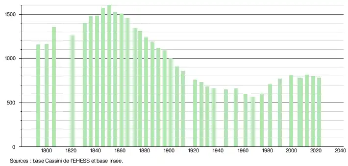 L'évolution du nombre d'habitants est connue à travers les recensements de la population effectués dans la commune depuis 1793. Pour les communes de moins de 10 000 habitants, une enquête de recensement portant sur toute la population est réalisée tous les cinq ans, les populations de référence des années intermédiaires étant quant à elles estimées par interpolation ou extrapolation[14]. Pour la commune, le premier recensement exhaustif entrant dans le cadre du nouveau dispositif a été réalisé en 2007[15].