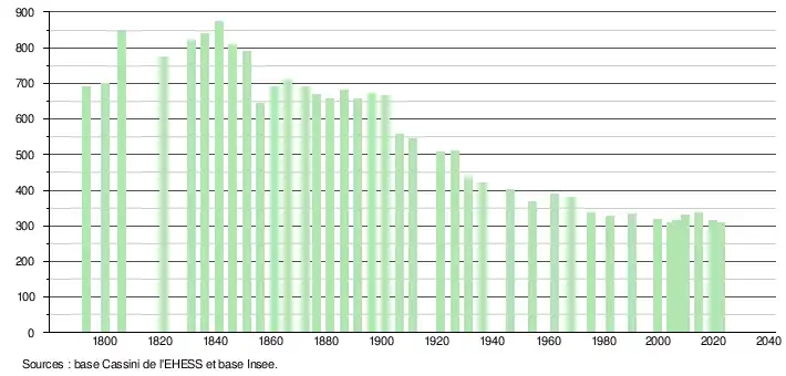 L'évolution du nombre d'habitants est connue à travers les recensements de la population effectués dans la commune depuis 1793. Pour les communes de moins de 10 000 habitants, une enquête de recensement portant sur toute la population est réalisée tous les cinq ans, les populations de référence des années intermédiaires étant quant à elles estimées par interpolation ou extrapolation[16]. Pour la commune, le premier recensement exhaustif entrant dans le cadre du nouveau dispositif a été réalisé en 2004[17].