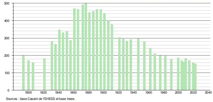 L'évolution du nombre d'habitants est connue à travers les recensements de la population effectués dans la commune depuis 1793. Pour les communes de moins de 10 000 habitants, une enquête de recensement portant sur toute la population est réalisée tous les cinq ans, les populations de référence des années intermédiaires étant quant à elles estimées par interpolation ou extrapolation[13]. Pour la commune, le premier recensement exhaustif entrant dans le cadre du nouveau dispositif a été réalisé en 2004[14].