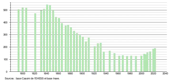 L'évolution du nombre d'habitants est connue à travers les recensements de la population effectués dans la commune depuis 1793. Pour les communes de moins de 10 000 habitants, une enquête de recensement portant sur toute la population est réalisée tous les cinq ans, les populations de référence des années intermédiaires étant quant à elles estimées par interpolation ou extrapolation[22]. Pour la commune, le premier recensement exhaustif entrant dans le cadre du nouveau dispositif a été réalisé en 2004[23].