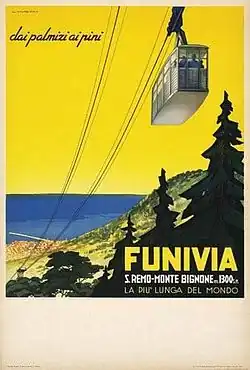 « Les six voitures, essentiellement constituées d'acier inoxydable, avancent sur huit roues et sont éclairées électriquement. 25 personnes peuvent y être convenablement assises et de larges fenêtres vitrées permettent d'admirer le paysage, qui se déroule comme une fantasmagorie devant leurs yeux stupéfaits. Chaque voiture est reliée aux autres par un câble permettant à chaque station aux passagers et aux conducteurs de communiquer entre eux ainsi qu'avec l'extérieur. Le nouveau téléphérique San Remo - Monte Bignone est un signe des temps. Construite pendant que les sanctions faisaient rage, tout ce qui a été nécessaire à son équipement - machines, câbles métalliques, appareils de mesure, de commande, de contrôle - fut malgré tout produit par le travail italien. »