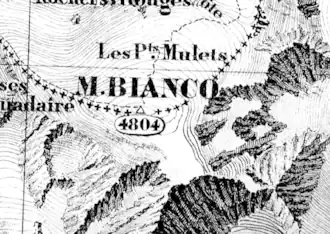 L'oronyme de la montagne devient « mont Blanc » sur les croquis dressés en 1742[4],[10],[11] par le naturaliste genevois Pierre Martel[8]. Le Dictionnaire historique et géographique portatif de l'Italie, paru en 1775 à Paris, possède d'ailleurs une entrée pour le mont Blanc précisant les différentes appellations avec en premier nom « Monte Maledetto, Mont Maudit, ou Mont Blanc, appelé aussi les Glacières »[12]. Un des sommets du massif, le mont Maudit, conserve cette dénomination. La première carte à proprement parler à faire figurer le nom du mont Blanc est celle de Suisse établie par le Britannique William Faden en 1778[11].