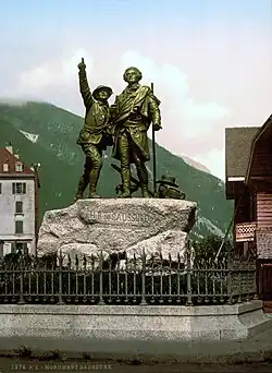 La première ascension de Balmat et Paccard est par ailleurs largement éclipsée par celle de Saussure un an plus tard, qui reste 4 h 30 au sommet et qui publie son récit dans Relation abrégée d'un voyage à la cime du Mont Blanc[55]. La controverse est relancée par Alexandre Dumas : en 1832, cinq ans après la mort de Paccard, il dîne avec Balmat qui fait un récit encore plus à son avantage de l'ascension de 1786. Dumas publie ce récit dans son livre Impressions de Voyage en Suisse[56] qui assied la légende de Balmat, conquérant du mont Blanc, et relègue dans l'oubli la participation de Paccard. Pour preuve, la statue érigée à Chamonix en 1887, à la gloire de Balmat et Saussure. Il faut attendre 1986 pour que la statue en l'honneur de Paccard soit érigée.