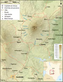 Le mont Kenya se situe sur les hauts plateaux du Kenya, à l'est de la vallée du Grand Rift, à 150 kilomètres au nord-nord-est de Nairobi[14]. | ||