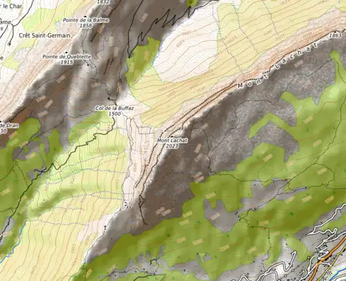 Le mont Lachat culmine à 2 019 mètres au-dessus des Villards-sur-Thônes ; son sommet est marqué par une croix en fer fabriquée par les Villardins.