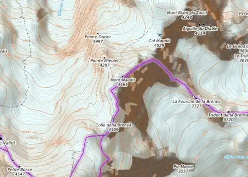 | Voie la plus facile | face Nord (PD+) depuis l'aiguille du Midi | ||||