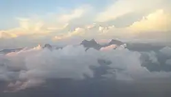 Vue aérienne annotée du mont Orohena, du Pito Hiti et du mont Aorai à l'aplomb de la vallée de Papenoo. | |||