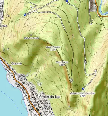 Un téléphérique est aménagé entre la commune de Veyrier et le mont Baron, afin de servir de belvédère au-dessus du lac d'Annecy[9]. Mis en service dès 1934 et laissé à l'abandon à partir de 1984, le téléphérique aura transporté plus de 2 millions de passagers durant les 50 années de son fonctionnement[réf. nécessaire]. La gare d'arrivée a été définitivement déconstruite en 2001, alors que la gare inférieure a été dévolue à la Cinémathèque des Pays de Savoie et de l'Ain en 2014[10].