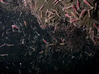 La vie au niveau des monts hydrothermaux est, contre toute attente, luxuriante[20]. Dans un environnement abyssal à moins de 2 °C, une pression hydrostatique élevée (entre 100 et 500 bars[21]), d'importantes communautés vivantes se sont développées, alors qu'en l'absence de lumière, aucune production primaire photosynthétique, base de tout écosystème, n'est envisageable. La découverte de l’écosystème associé aux sources hydrothermales a bouleversé les connaissances en biologie de l’époque et notamment la conviction que la vie macroscopique était impossible sans lumière. Au niveau des sources hydrothermales, la production primaire est assurée par des micro-organismes chimiosynthétiques. Ces organismes chimiolithotrophes utilisent l'énergie chimique des sels dissous pour remplir la fonction de la photosynthèse chez les végétaux. Ils forment ainsi le premier maillon de la chaîne alimentaire, dont se nourrissent les consommateurs primaires. On trouve aussi des associations symbiotiques dans lesquels le symbiote apporte l’énergie à l’hôte.