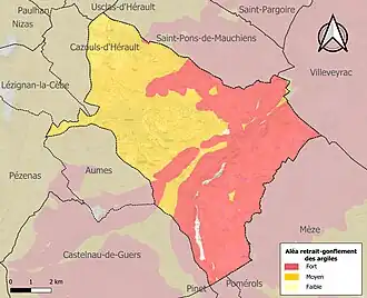 Le retrait-gonflement des sols argileux est susceptible d'engendrer des dommages importants aux bâtiments en cas d’alternance de périodes de sécheresse et de pluie. 98,9 % de la superficie communale est en aléa moyen ou fort (59,3 % au niveau départemental et 48,5 % au niveau national). Sur les 1 769 bâtiments dénombrés sur la commune en 2019, 1 765 sont en aléa moyen ou fort, soit 100 %, à comparer aux 85 % au niveau départemental et 54 % au niveau national. Une cartographie de l'exposition du territoire national au retrait gonflement des sols argileux est disponible sur le site du BRGM[28],[Carte 1].