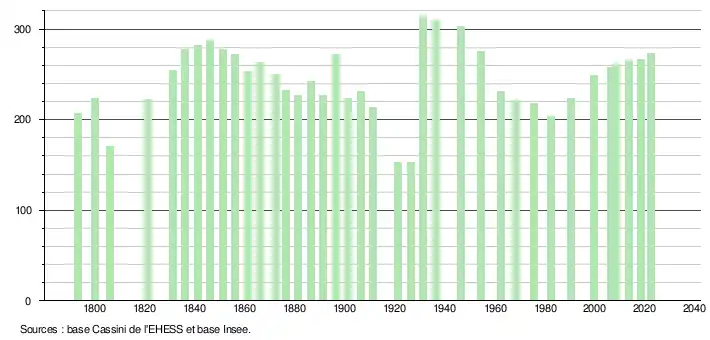L'évolution du nombre d'habitants est connue à travers les recensements de la population effectués dans la commune depuis 1793. Pour les communes de moins de 10 000 habitants, une enquête de recensement portant sur toute la population est réalisée tous les cinq ans, les populations de référence des années intermédiaires étant quant à elles estimées par interpolation ou extrapolation[13]. Pour la commune, le premier recensement exhaustif entrant dans le cadre du nouveau dispositif a été réalisé en 2008[14].