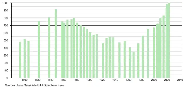 L'évolution du nombre d'habitants est connue à travers les recensements de la population effectués dans la commune depuis 1793. Pour les communes de moins de 10 000 habitants, une enquête de recensement portant sur toute la population est réalisée tous les cinq ans, les populations de référence des années intermédiaires étant quant à elles estimées par interpolation ou extrapolation[35]. Pour la commune, le premier recensement exhaustif entrant dans le cadre du nouveau dispositif a été réalisé en 2004[36].
