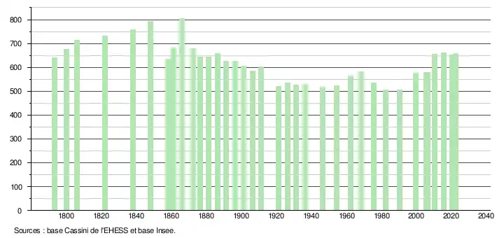L'évolution du nombre d'habitants est connue à travers les recensements de la population effectués dans la commune depuis 1793. Pour les communes de moins de 10 000 habitants, une enquête de recensement portant sur toute la population est réalisée tous les cinq ans, les populations de référence des années intermédiaires étant quant à elles estimées par interpolation ou extrapolation[18]. Pour la commune, le premier recensement exhaustif entrant dans le cadre du nouveau dispositif a été réalisé en 2005[19].
