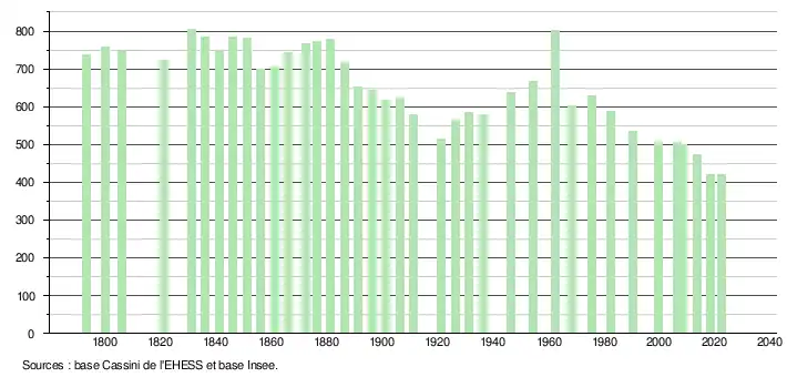 L'évolution du nombre d'habitants est connue à travers les recensements de la population effectués dans la commune depuis 1793. Pour les communes de moins de 10 000 habitants, une enquête de recensement portant sur toute la population est réalisée tous les cinq ans, les populations de référence des années intermédiaires étant quant à elles estimées par interpolation ou extrapolation[28]. Pour la commune, le premier recensement exhaustif entrant dans le cadre du nouveau dispositif a été réalisé en 2008[29].
