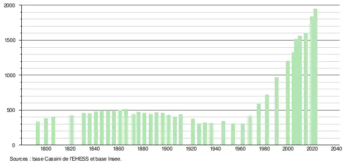 L'évolution du nombre d'habitants est connue à travers les recensements de la population effectués dans la commune depuis 1793. Pour les communes de moins de 10 000 habitants, une enquête de recensement portant sur toute la population est réalisée tous les cinq ans, les populations de référence des années intermédiaires étant quant à elles estimées par interpolation ou extrapolation[36]. Pour la commune, le premier recensement exhaustif entrant dans le cadre du nouveau dispositif a été réalisé en 2004[37].