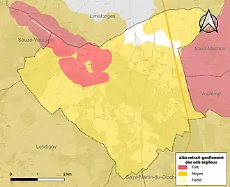 Les mouvements de terrains susceptibles de se produire sur la commune sont des tassements différentiels[15]. Le retrait-gonflement des sols argileux est susceptible d'engendrer des dommages importants aux bâtiments en cas d’alternance de périodes de sécheresse et de pluie[16]. 95,5 % de la superficie communale est en aléa moyen ou fort (54,9 % au niveau départemental et 48,5 % au niveau national)[Carte 2]. Depuis le , en application de la loi ELAN, différentes contraintes s'imposent aux vendeurs, maîtres d'ouvrages ou constructeurs de biens situés dans une zone classée en aléa moyen ou fort[Note 1],[17].