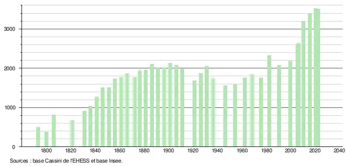 L'évolution du nombre d'habitants est connue à travers les recensements de la population effectués dans la commune depuis 1793. Pour les communes de moins de 10 000 habitants, une enquête de recensement portant sur toute la population est réalisée tous les cinq ans, les populations de référence des années intermédiaires étant quant à elles estimées par interpolation ou extrapolation[21]. Pour la commune, le premier recensement exhaustif entrant dans le cadre du nouveau dispositif a été réalisé en 2005[22].