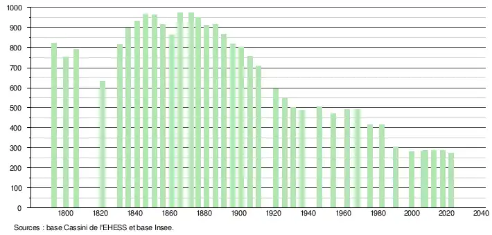 L'évolution du nombre d'habitants est connue à travers les recensements de la population effectués dans la commune depuis 1793. Pour les communes de moins de 10 000 habitants, une enquête de recensement portant sur toute la population est réalisée tous les cinq ans, les populations de référence des années intermédiaires étant quant à elles estimées par interpolation ou extrapolation[13]. Pour la commune, le premier recensement exhaustif entrant dans le cadre du nouveau dispositif a été réalisé en 2007[14].