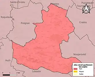 Le retrait-gonflement des sols argileux est susceptible d'engendrer des dommages importants aux bâtiments en cas d’alternance de périodes de sécheresse et de pluie. La totalité de la commune est en aléa moyen ou fort (94,5 % au niveau départemental et 48,5 % au niveau national). Sur les 338 bâtiments dénombrés sur la commune en 2019, 338 sont en aléa moyen ou fort, soit 100 %, à comparer aux 93 % au niveau départemental et 54 % au niveau national. Une cartographie de l'exposition du territoire national au retrait gonflement des sols argileux est disponible sur le site du BRGM[18],[Carte 3].