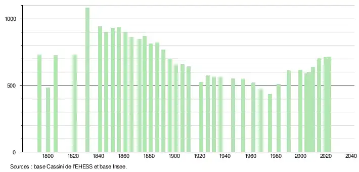 | L'évolution du nombre d'habitants est connue à travers les recensements de la population effectués dans la commune depuis 1793. Pour les communes de moins de 10 000 habitants, une enquête de recensement portant sur toute la population est réalisée tous les cinq ans, les populations de référence des années intermédiaires étant quant à elles estimées par interpolation ou extrapolation[22]. Pour la commune, le premier recensement exhaustif entrant dans le cadre du nouveau dispositif a été réalisé en 2004[23]. En 2022, la commune comptait 714 habitants[Note 3], en évolution de +0,99 % par rapport à 2016 (Gers : +1,04 %, France hors Mayotte : +2,11 %). |