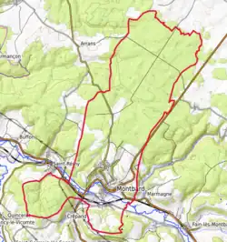 L'occupation des sols de la commune, telle qu'elle ressort de la base de données européenne d’occupation biophysique des sols Corine Land Cover (CLC), est marquée par l'importance des forêts et milieux semi-naturels (74,5 % en 2018), une proportion sensiblement équivalente à celle de 1990 (74,6 %). La répartition détaillée en 2018 est la suivante : forêts (70 %), terres arables (13 %), zones urbanisées (4,6 %), milieux à végétation arbustive et/ou herbacée (4,5 %), prairies (4,2 %), zones industrielles ou commerciales et réseaux de communication (2,2 %), zones agricoles hétérogènes (1,5 %)[11]. L'évolution de l’occupation des sols de la commune et de ses infrastructures peut être observée sur les différentes représentations cartographiques du territoire : la carte de Cassini (XVIIIe siècle), la carte d'état-major (1820-1866) et les cartes ou photos aériennes de l'IGN pour la période actuelle (1950 à aujourd'hui)[Carte 1].
