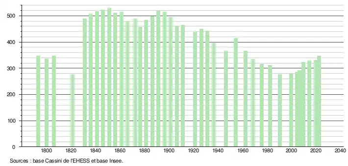 L'évolution du nombre d'habitants est connue à travers les recensements de la population effectués dans la commune depuis 1793. Pour les communes de moins de 10 000 habitants, une enquête de recensement portant sur toute la population est réalisée tous les cinq ans, les populations de référence des années intermédiaires étant quant à elles estimées par interpolation ou extrapolation[24]. Pour la commune, le premier recensement exhaustif entrant dans le cadre du nouveau dispositif a été réalisé en 2004[25].