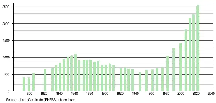 L'évolution du nombre d'habitants est connue à travers les recensements de la population effectués dans la commune depuis 1793. Pour les communes de moins de 10 000 habitants, une enquête de recensement portant sur toute la population est réalisée tous les cinq ans, les populations de référence des années intermédiaires étant quant à elles estimées par interpolation ou extrapolation[24]. Pour la commune, le premier recensement exhaustif entrant dans le cadre du nouveau dispositif a été réalisé en 2006[25].