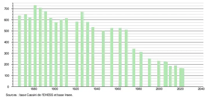 L'évolution du nombre d'habitants est connue à travers les recensements de la population effectués dans la commune depuis 1866. Pour les communes de moins de 10 000 habitants, une enquête de recensement portant sur toute la population est réalisée tous les cinq ans, les populations de référence des années intermédiaires étant quant à elles estimées par interpolation ou extrapolation[15]. Pour la commune, le premier recensement exhaustif entrant dans le cadre du nouveau dispositif a été réalisé en 2005[16].