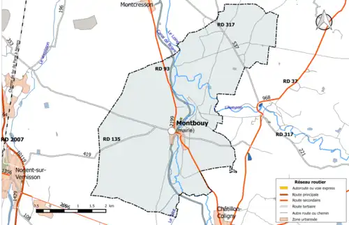 La commune de Montbouy se trouve à l'extrême est du département du Loiret, dans la région agricole du Gâtinais pauvre[2]. À vol d'oiseau, elle se situe à 68,1 km d'Orléans[3], préfecture du département, à 16,1 km de Montargis[4], sous-préfecture, et à 5,0 km de Châtillon-Coligny, ancien chef-lieu du canton dont dépendait la commune avant . La commune fait partie du bassin de vie de Châtillon-Coligny[5].