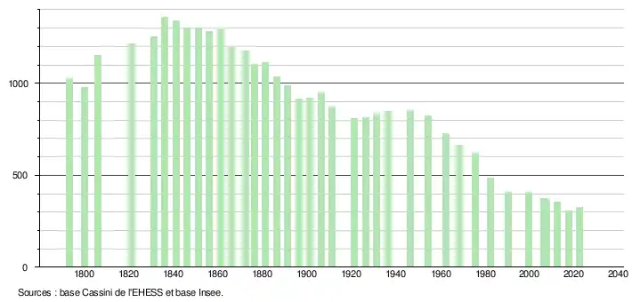 L'évolution du nombre d'habitants est connue à travers les recensements de la population effectués dans la commune depuis 1793. Pour les communes de moins de 10 000 habitants, une enquête de recensement portant sur toute la population est réalisée tous les cinq ans, les populations de référence des années intermédiaires étant quant à elles estimées par interpolation ou extrapolation[36]. Pour la commune, le premier recensement exhaustif entrant dans le cadre du nouveau dispositif a été réalisé en 2007[37].